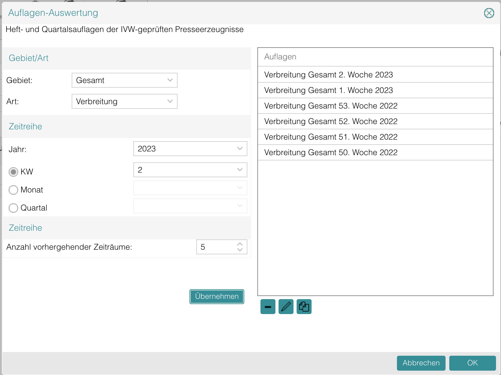 Wählen Sie links, welches Gebiet und welche Auflagenart Sie auswählen wollen und ab welcher KW, welchem Monat oder welchem Quartal die Zeitreihe zurück gehen soll. Bei "Anzahl vorhergehender Zeiträume" geben Sie dann ein, wie viele Zeitintervalle Sie zurückgehen möchten.