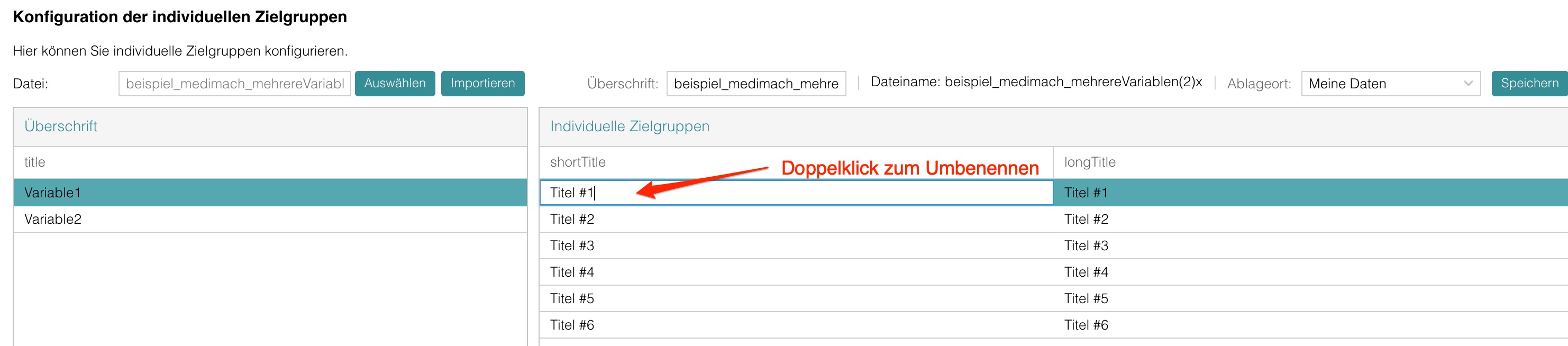 Die Bezeichnungen der Zielgruppen werden direkt aus der Excel-/CSV-Datei übernommen, können aber durch Doppelklick auf den Text bearbeitet werden. Hier können Sie den Zielgruppen und ihren Ausprägungen Labels (Bezeichnungen / Namen) geben, mit denen sie in mediMACH angezeigt werden sollen.
