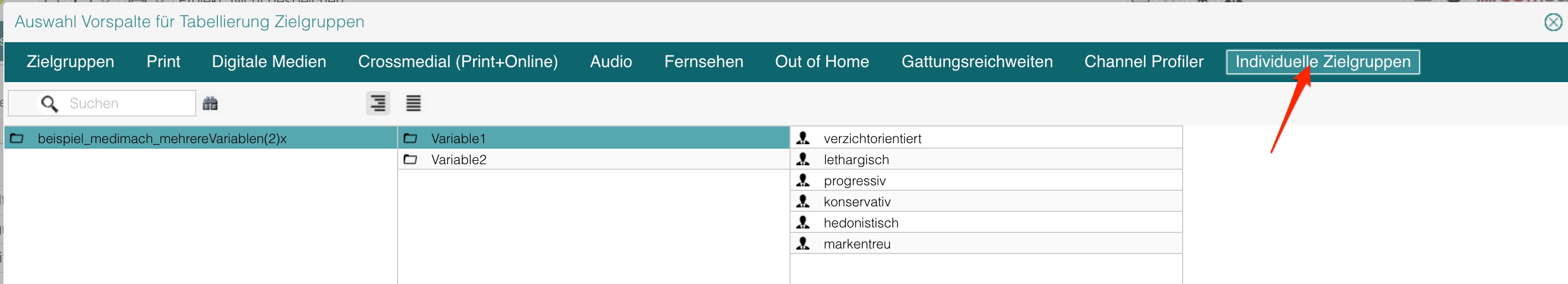 Sobald Sie eines oder mehrere Sets von individuellen Zielgruppen gespeichert haben, stehen Ihnen diese in dem Studienjahrgang zur Verfügung. Sie finden die eingelesenen Zielgruppen im Selektionsdialog in einem Extra-Reiter ganz rechts neben allen anderen Reitern (Zielgruppen, Mediengattungen ...), die die Studie zu bieten hat.