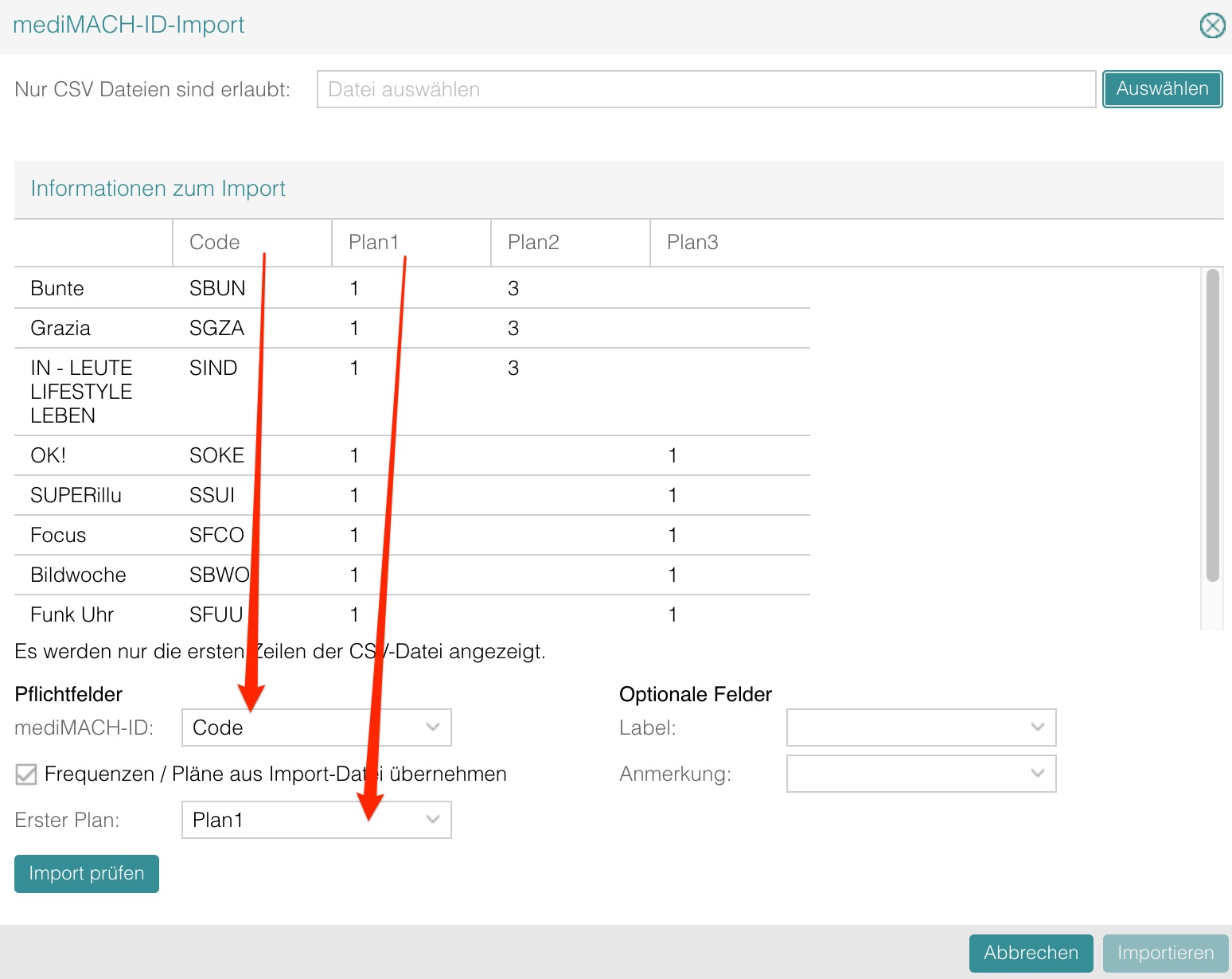 Diese Importvariante ermöglicht es, gleich mehrere Pläne zu importieren, die sich als Spalten nebeneinander in einer CSV-Tabelle befinden. Die Funktion befindet sich im Planungsbereich, wo auch die anderen Import-Optionen zu finden sind (Import-Button oben links).