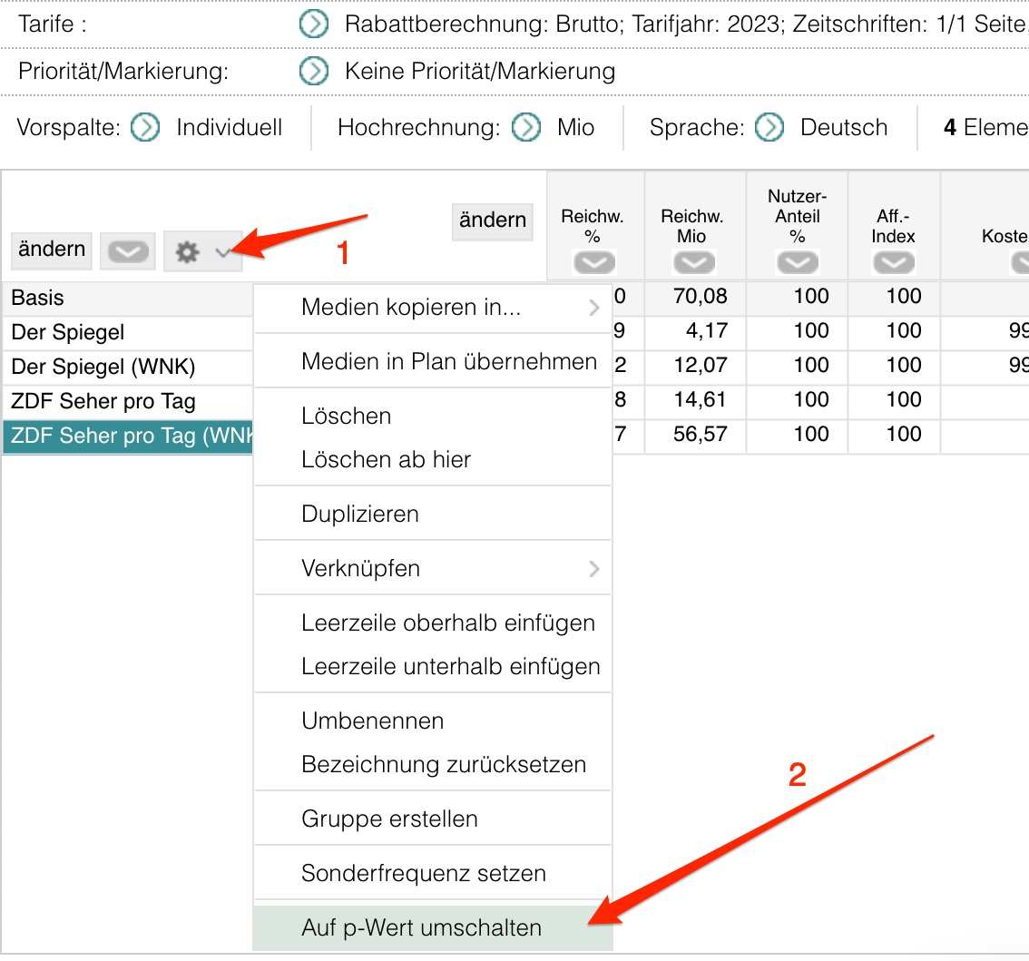 Diese Option - die Umstellung von der p-Wert-Verwendung auf den WNK - finden Sie neben einigen anderen nützlichen Funktionen im Zahnrad-Menü. Dieses Menü wird aktiv, sobald Sie in der Selektion oder alternativ in der Vorspalte einer Auswertung Medien ausgewählt haben.: