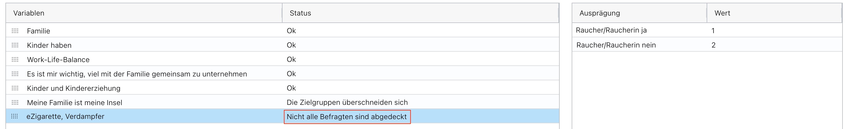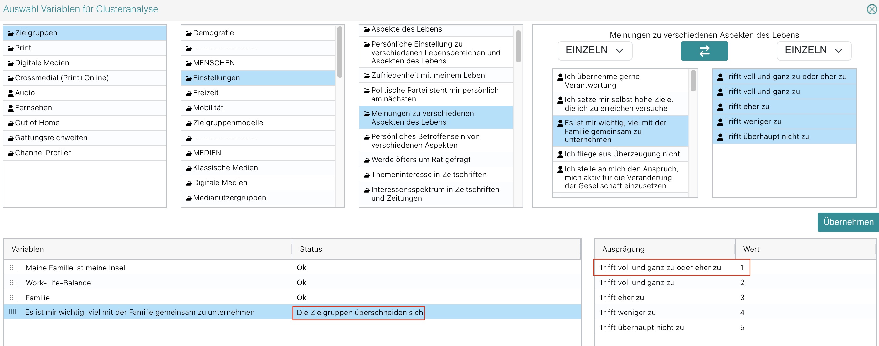 Beide Kriterien gelten nur für Markmale mit mehreren Ausprägungen. Wählen Sie einzelne Ausprägungen, so wird jeweils die Gegengruppe (Auspärgung erfüllt vs. Ausprägung nicht erfüllt) in die Clusteranalyse mit einbezogen, so dass eine Überschneidung oder eine Nichtabdeckung der Grundgesamheit kein Problem werden kann.