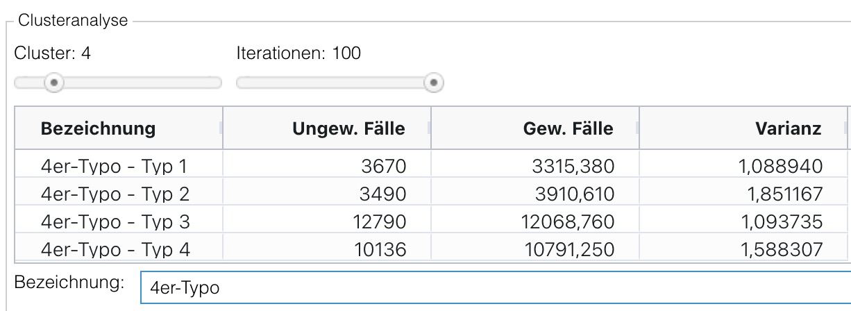 - Tabellierung (ganz unten): Hier werden die Cluster im Kopf einer Kreuztabelle dargestellt und die Vorspalte mit den aktiven Variablen gefüllt. Dadurch erlangen Sie die Möglichkeit, sich ein Bild von der Zusemmansetzung der Cluster zu bekommen, bevor Sie sie abspeichern (siehe Abschnitt weiter unten).