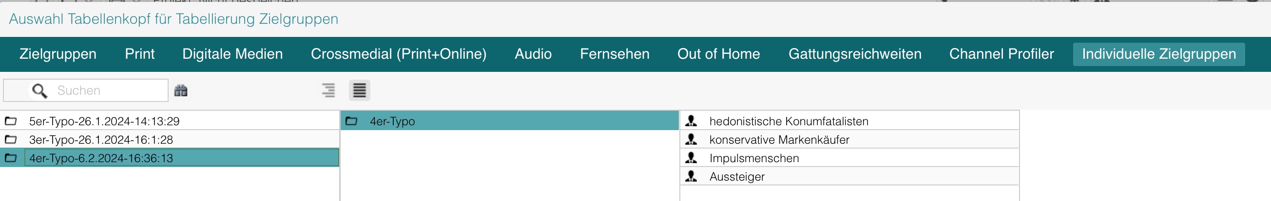 Die Typologie kann anschließend in der in der Selektion (z.B. einer Tabellierung) verwendet werden. Sie finden neben den Reitern „Zielgruppen“ und den verschiedenen Gattungen dann oben einen Extra-Reiter mit dem Namen „Individuelle Zielgruppen“.