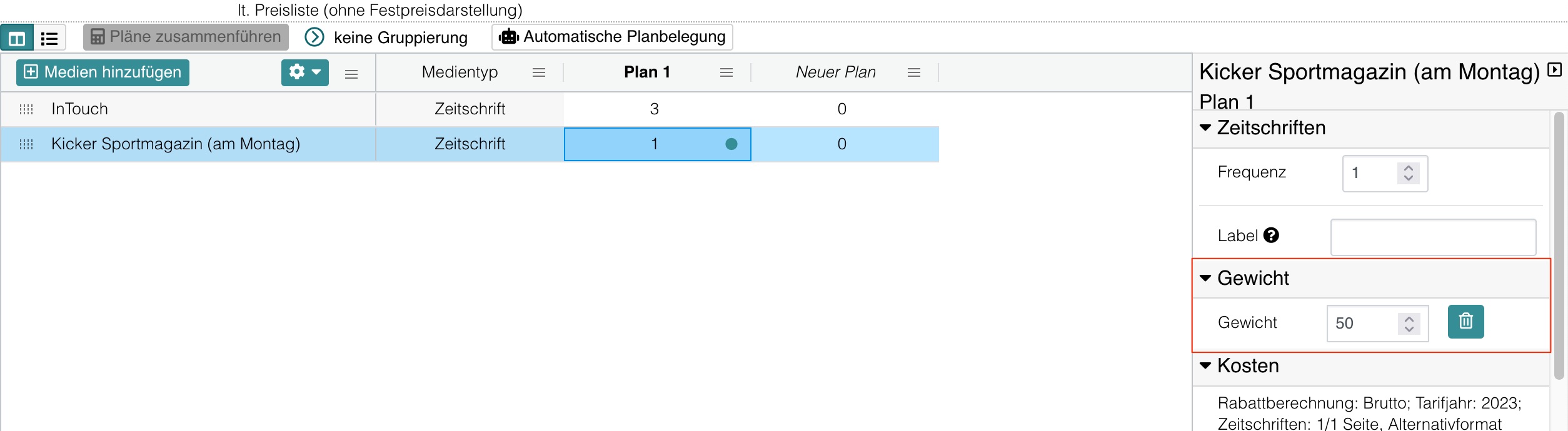 Markieren Sie eine oder mehrere Belegungen, damit das Panel sichtbar wird. Das Mediengewicht ermöglicht eine teilweise Berücksichtigung der Nutzung eines Mediums bei der Auswertung und kann Werte zwischen 0 und 100 Prozent annehmen. Standardmäßig ist das Gewicht auf 100 Prozent eingestellt. Wenn das Mediengewicht beispielsweise auf 50 Prozent gesetzt wird, reduziert sich die Reichweite um 50 Prozent.