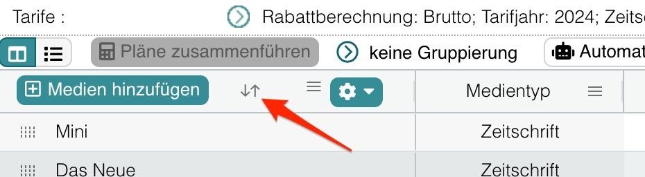 Sie können in der Planübersicht nach der ersten Spalte (Name des Mediums) sowie nach allen Info-Spalten sortieren. Mit dem ersten Klick auf das Pfeil-Symbol wird alphabetisch aufsteigend sortiert, mit dem zweiten Klick absteigend. Mit einem dritten Klick auf den Pfeil wird die ursprüngliche Reihenfolge wiederhergestellt.